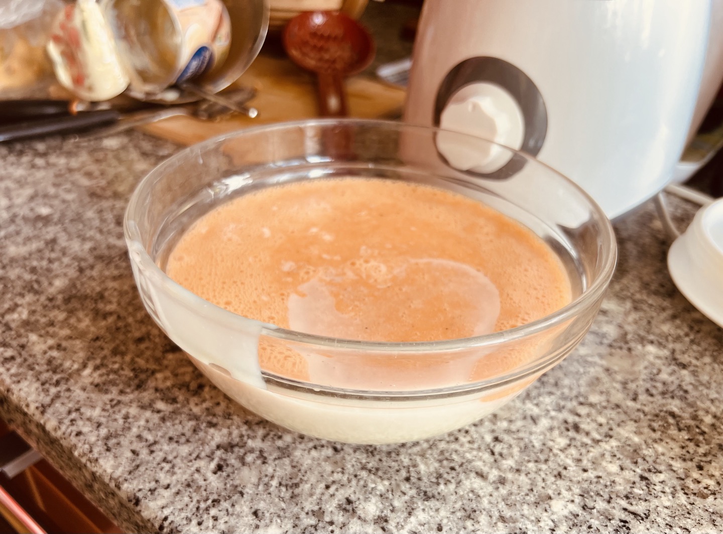 채에 걸러진 쿠루바 과즙만 채취하여 연유와 1:1의 비율로 골고루 잘 섞어줍니다. 이 비율은 연유를 그릇에 붇고 난 빈통에 쿠루바 10개 분량의 과즙을 넣어면 ㄷ딱 맞아 떨어집니다.